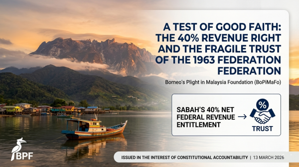 Sabah’s 40% Revenue Right: If the Promises of 1963 Are Broken, What Remains of the Federation? Borneo’s Plight in Malaysia Foundation (BoPiMaFo) notes the Federal Government’s decision to appeal the Kota Kinabalu High Court ruling concerning Sabah’s constitutional entitlement to 40% of the net federal revenue derived from the state.