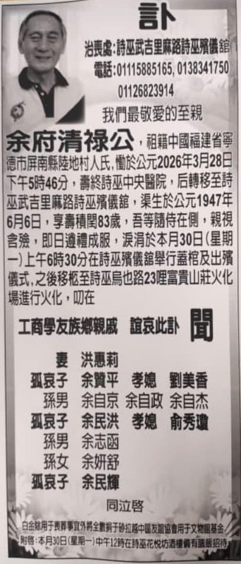 [1] 毕生献身社会工作 余清禄辞世享年79岁. (2026, March 28). 星洲日报. https://sarawak.sinchew.com.my/news/20260328/sarawak/7377835
